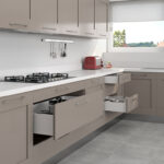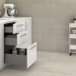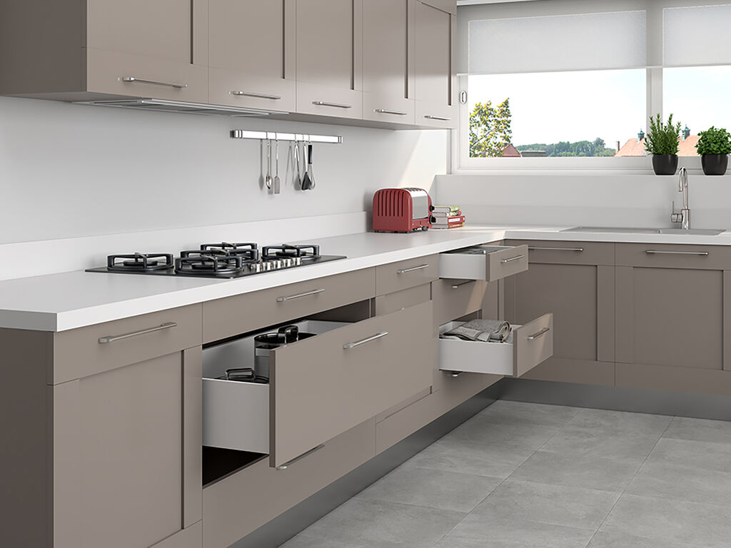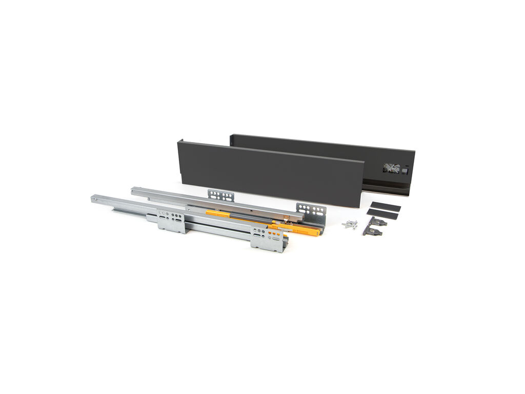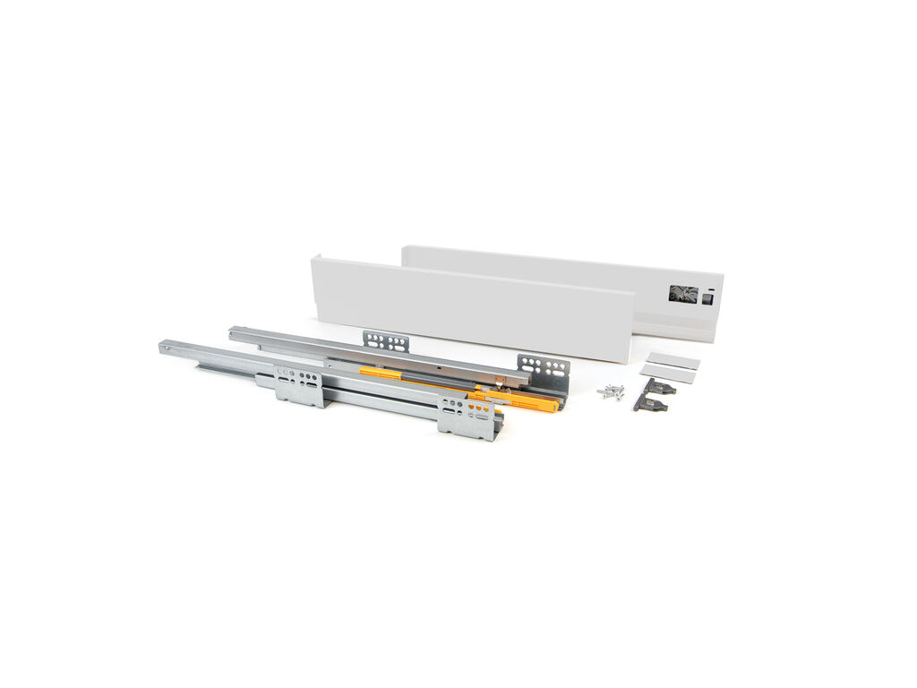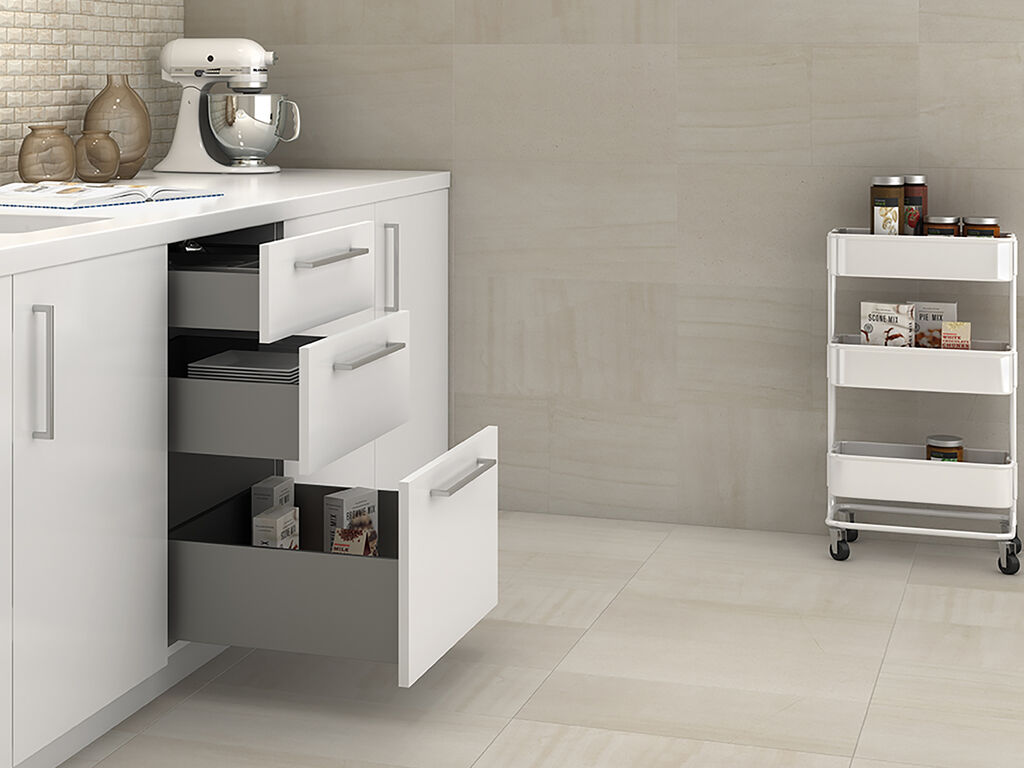 The Concept drawer for kitchens and bathrooms is available in a kit format with all of the fittings needed for its assembly. It also stands out for its great load capacity that can support up to 30 kg per drawer. It includes total extraction runners with soft closing , a set of hooks and sides available in a white painted or anthracite grey finish. You will only need the boards cut to the correct dimensions for the bottom, the back and the front of the drawer.
