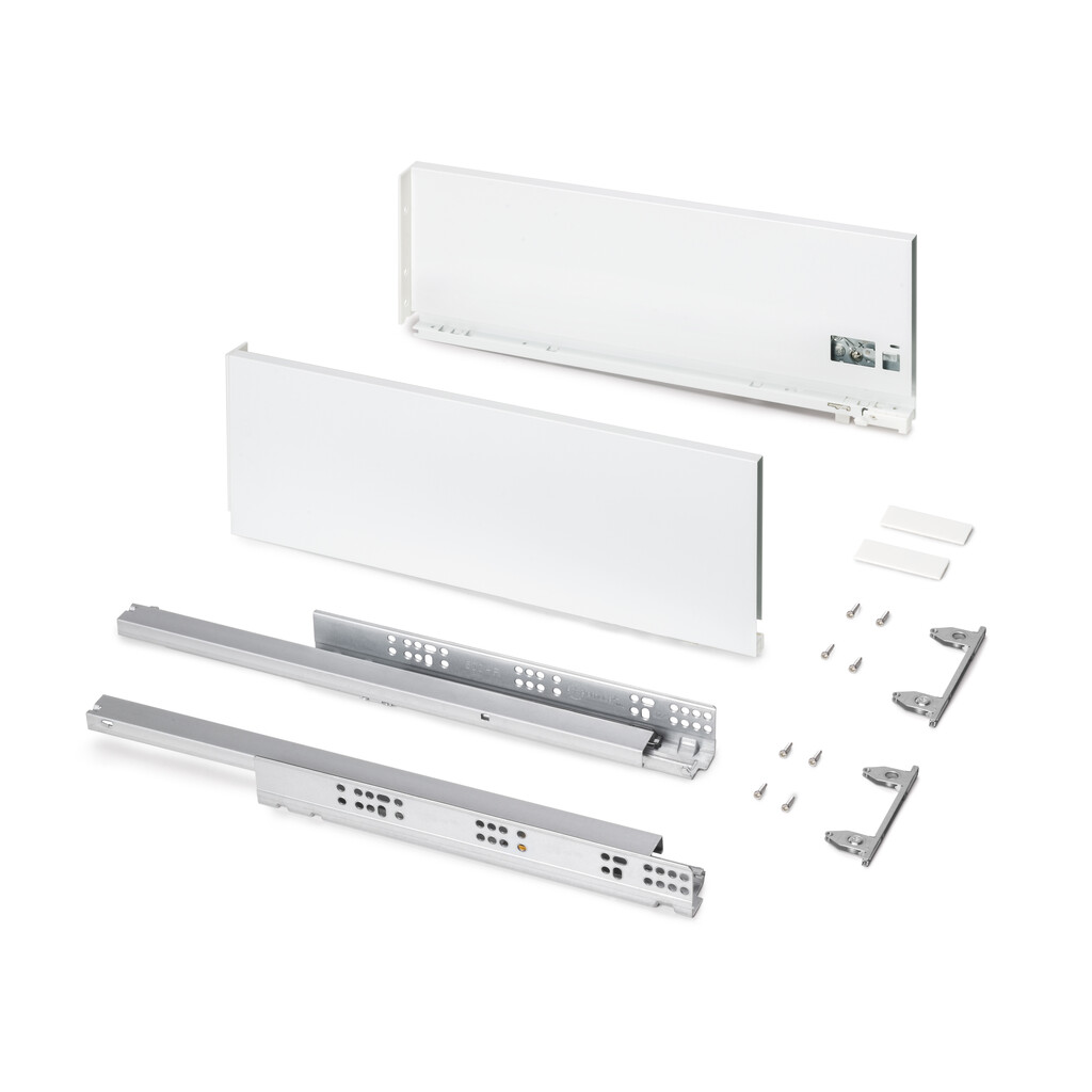 The Protone drawer for kitchens and bathrooms is available in a kit format with all of the fittings needed for its assembly. It also stands out for its great load capacity that can support up to 30 kg per drawer. It includes total extraction runners with soft closing , a set of hooks and sides available in a white painted or anthracite grey finish. You will only need the boards cut to the correct dimensions for the bottom, the back and the front of the drawer.