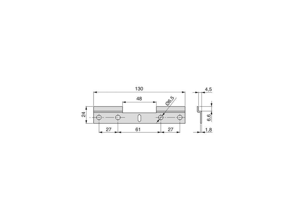 Αυτό το λαμάκι είναι απαραίτητο για τη στερέωση των κρεμαστρών του συστήματος Level-up 1 για σύνδεση στον τοίχο, ιδανικό για την εγκατάσταση ψηλών ντουλαπιών. Το κομμάτι είναι κατασκευασμένο από ατσάλι με φυσικό φινίρισμα και έχει διαστάσεις 130 mm μήκος και 24 mm πλάτος, με πάχος 1,8 mm. Το λαμάκι διαθέτει δύο αναδιπλωμένα πτερύγια, εξασφαλίζοντας εύκολη τοποθέτηση των κρεμαστρών και προσφέροντας σταθερή δομή. Η εγκατάσταση γίνεται με βίδωμα και έχει οπές διαμέτρου 6,5 mm.